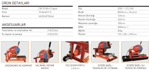 Kompakt ve ergonomik tasarımı sayesinde CM 35 Mini Clipper, şantiye alanlarına ve endüstriyel ortamlara kusursuz şekilde uyum sağlar. En iyi performans için Norton Clipper elmas kesici bıçaklarla kullanılması tavsiye edilir.